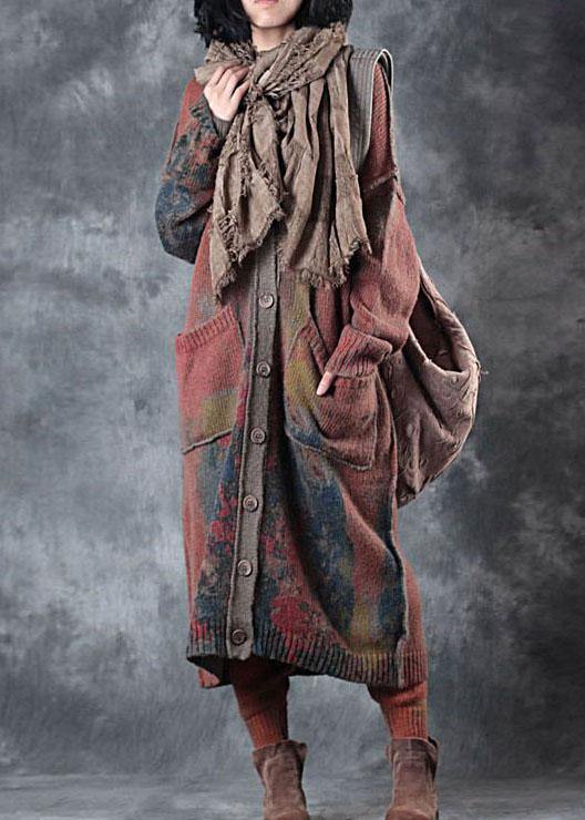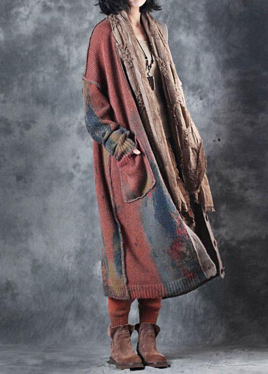 Boho oranje V-hals zakken herfst gebreide trui met knopen