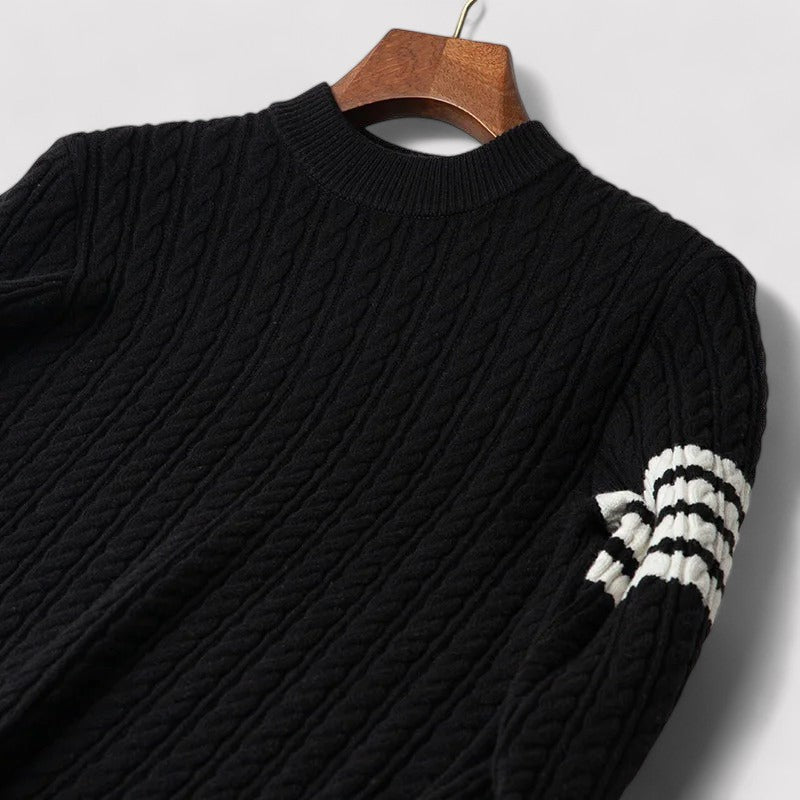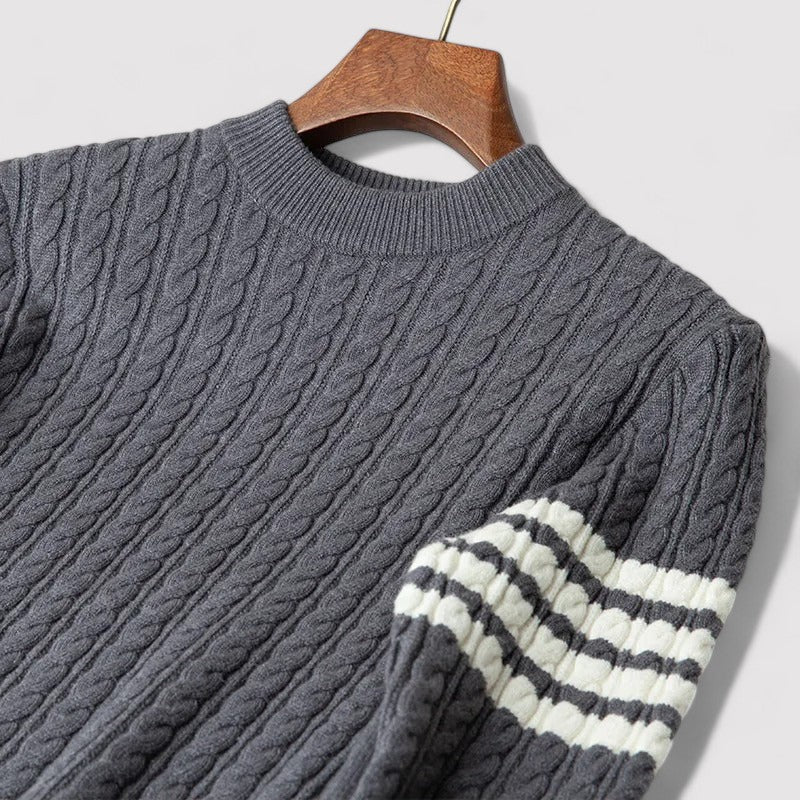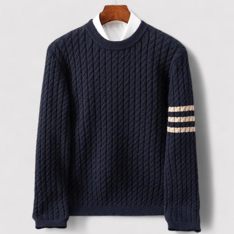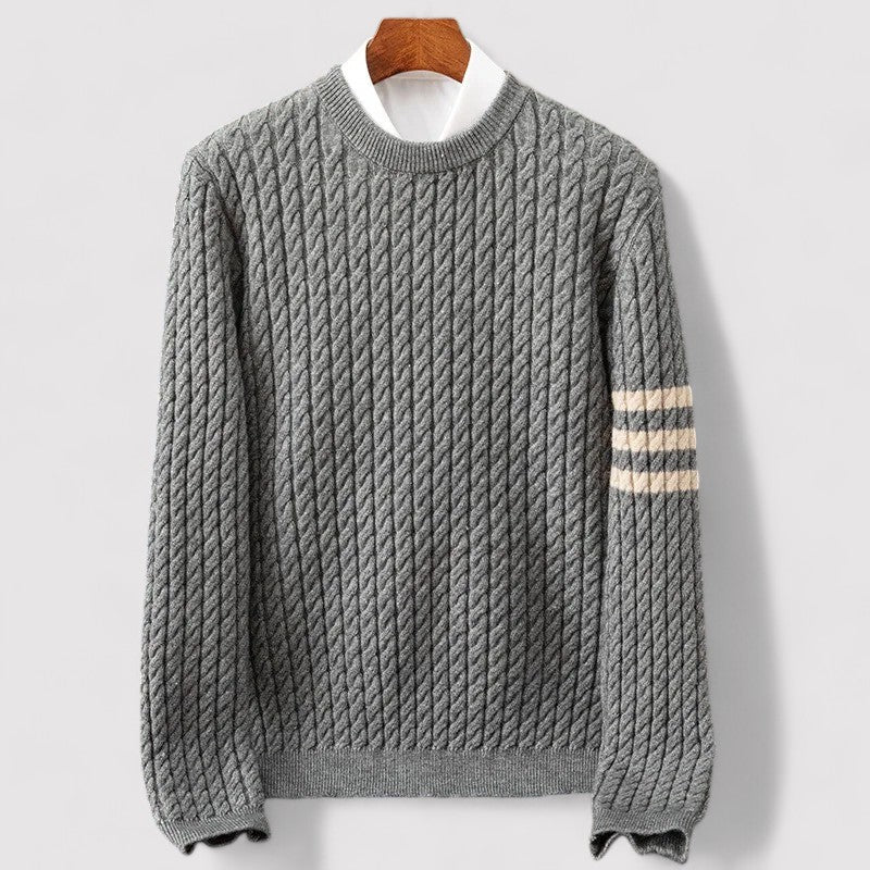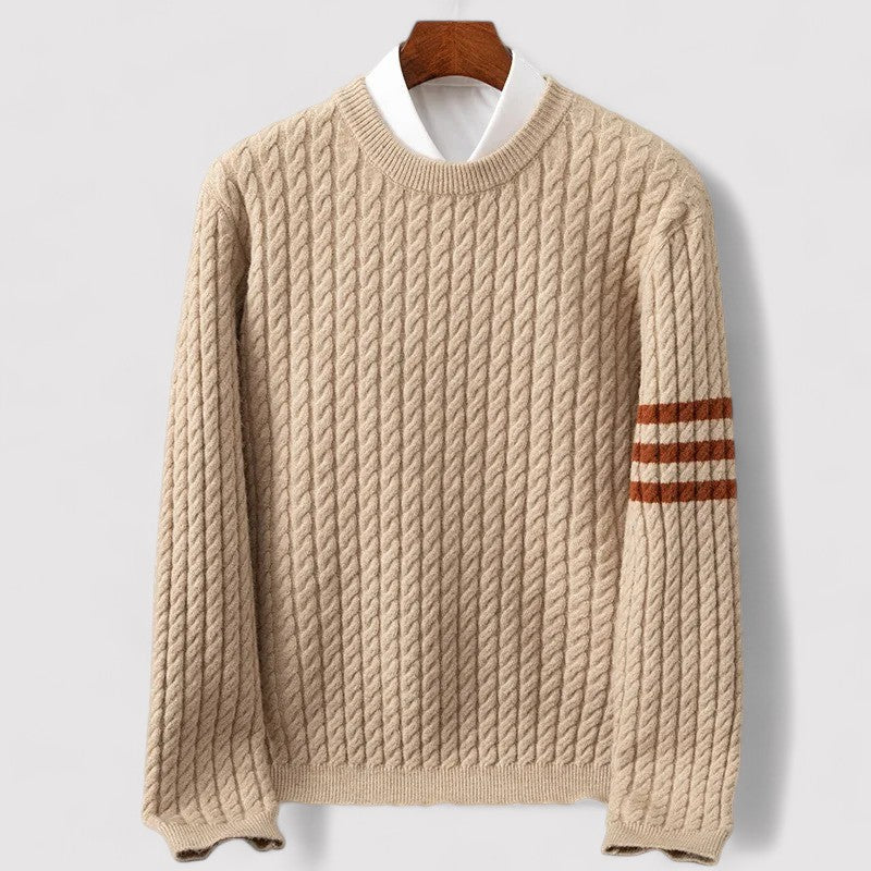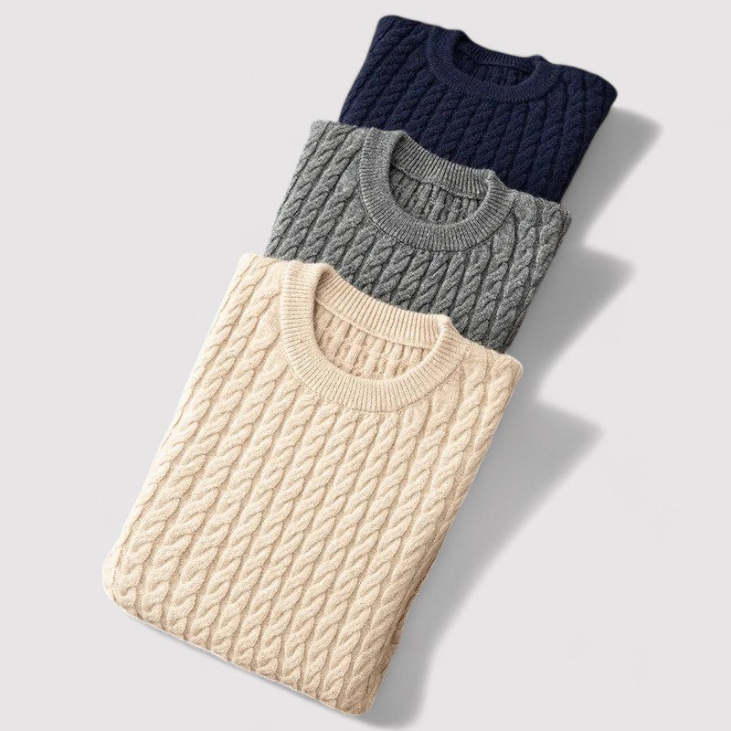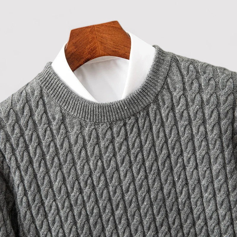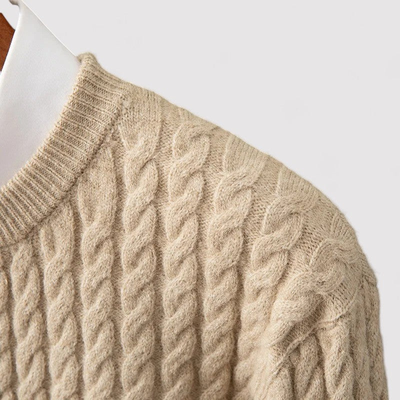 Upgrade je koud-weer garderobe met de Kabelgebreide Wollen Trui, een perfecte balans van warmte, stijl en klassieke charme.