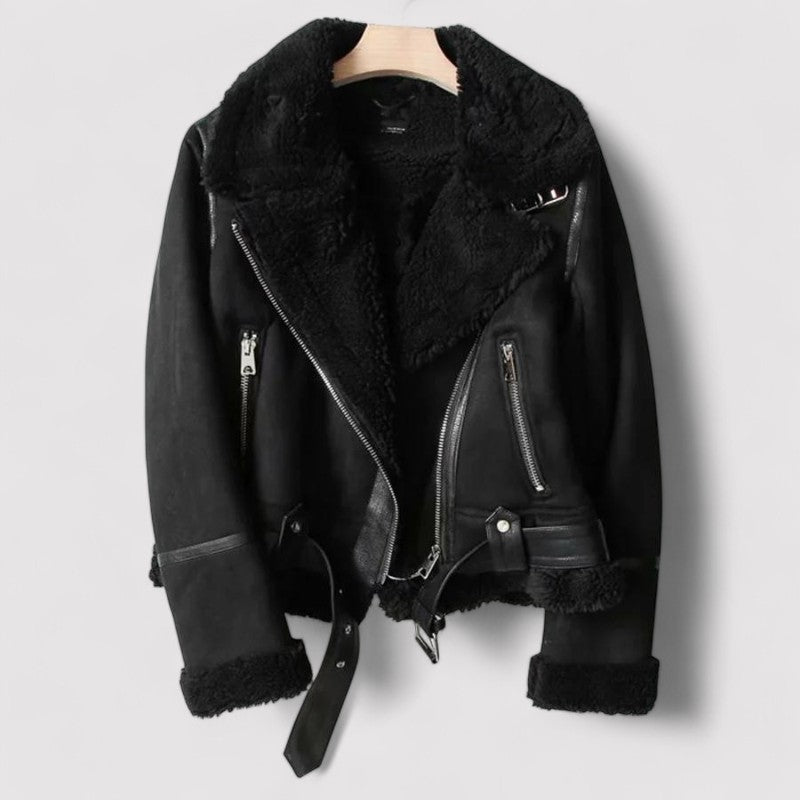 Laat je omarmen door de Amy – Leren jas met sherpa voering, waarin comfort en gedurfde stijl in perfecte harmonie samenkomen.