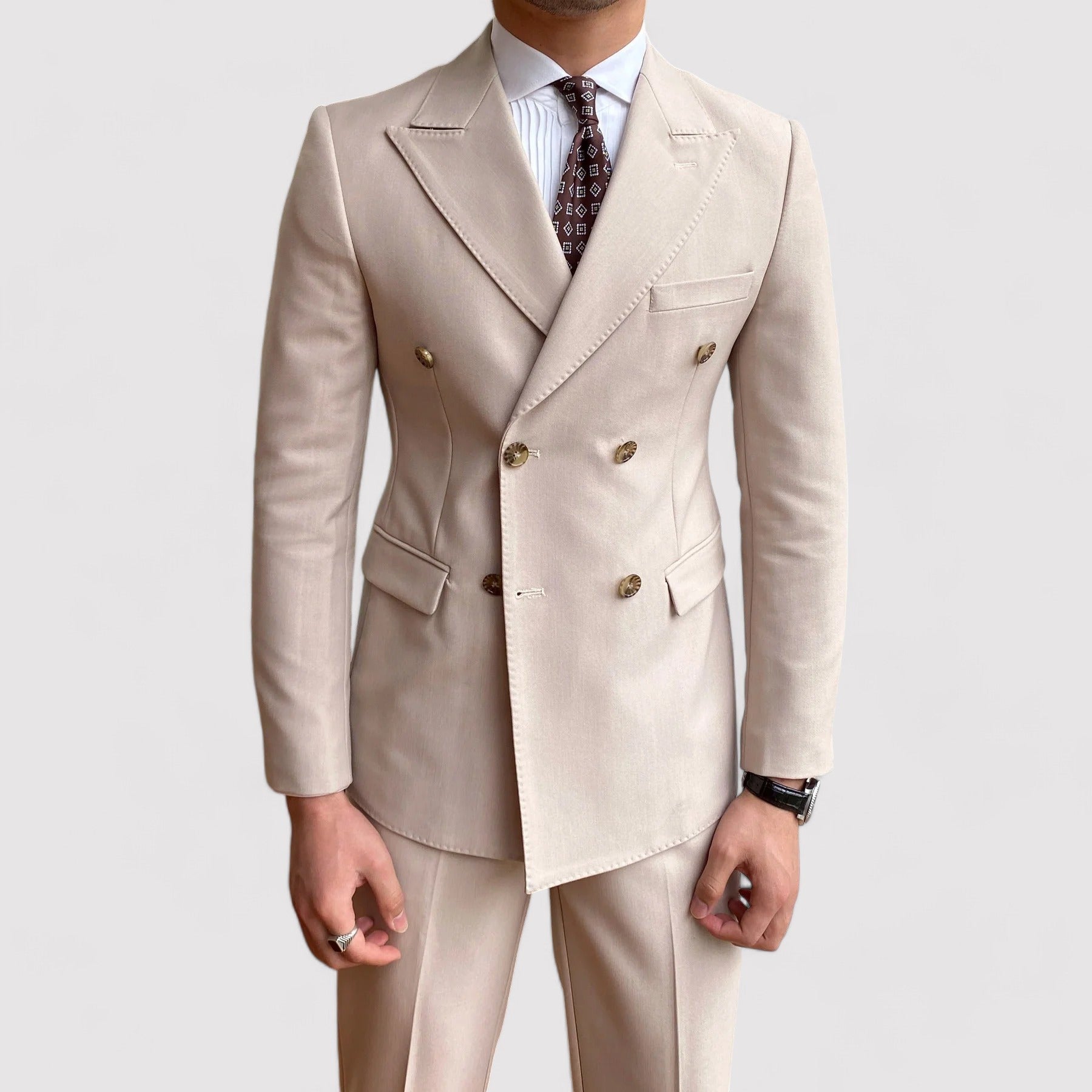 Het Old Money Double Button Suit is vakkundig gemaakt en combineert de duurzame elegantie van traditioneel kleermakerswerk met modern comfort. De precieze stiksels en op maat gemaakte pasvorm bieden een scherp silhouet zonder afbreuk te doen aan draagbaarheid, waardoor het de perfecte mix is van stijl en comfort voor de moderne levensstijl van vandaag.